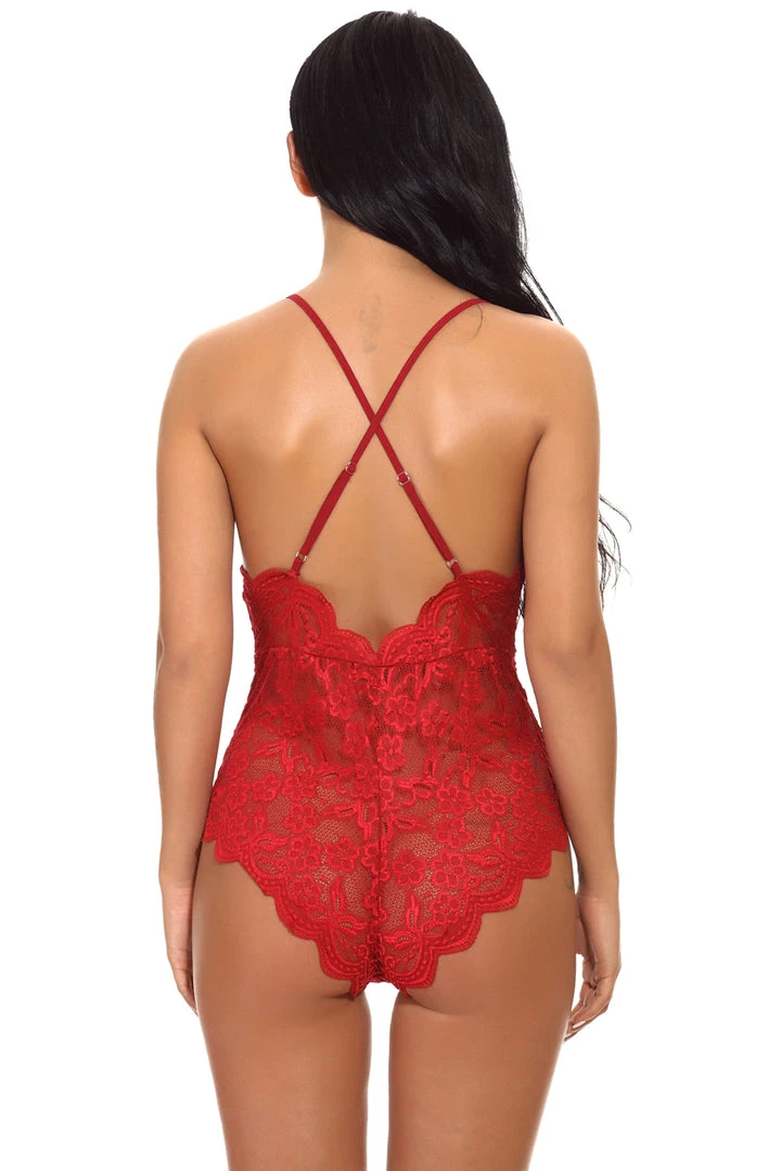 This rose red, floral lace teddy features a scalloped lace trim, a low cut bust, and criss cross back straps.
