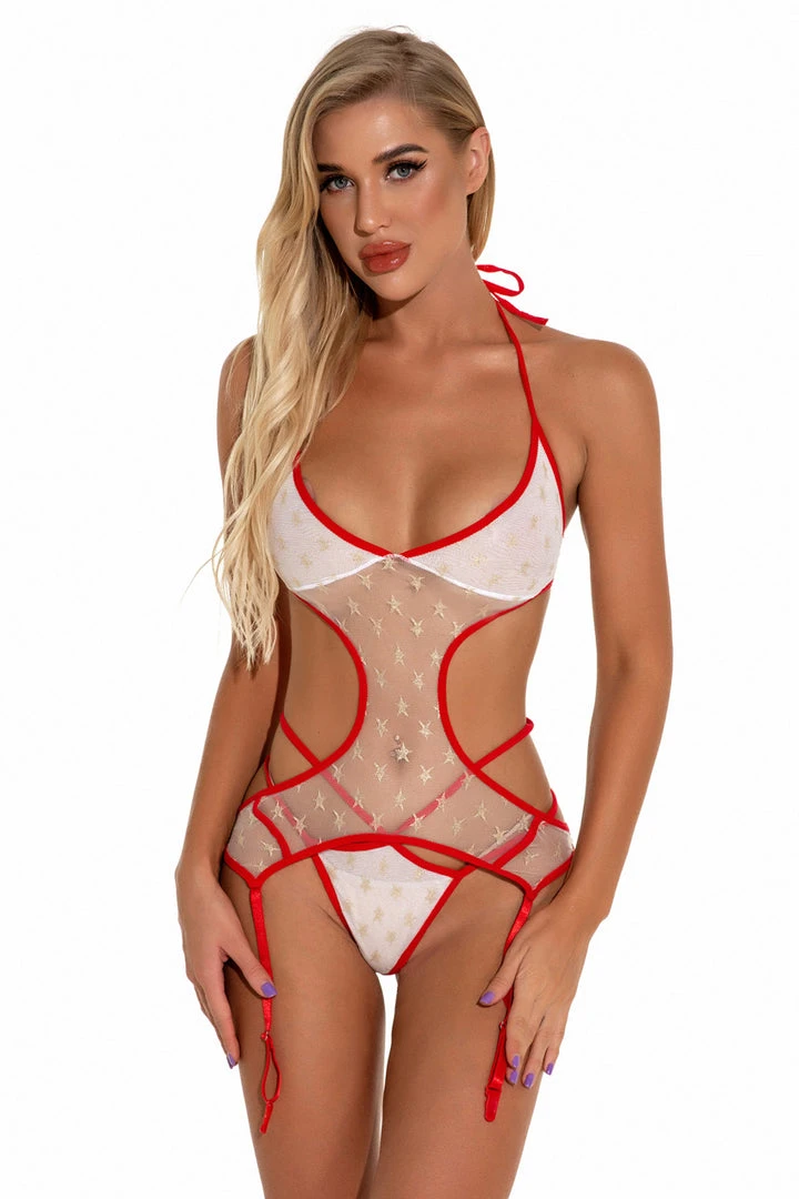 This She’s A Star teddy features a white star print mesh, red trim, cut out details, and attached garters.
