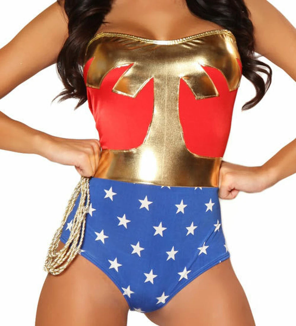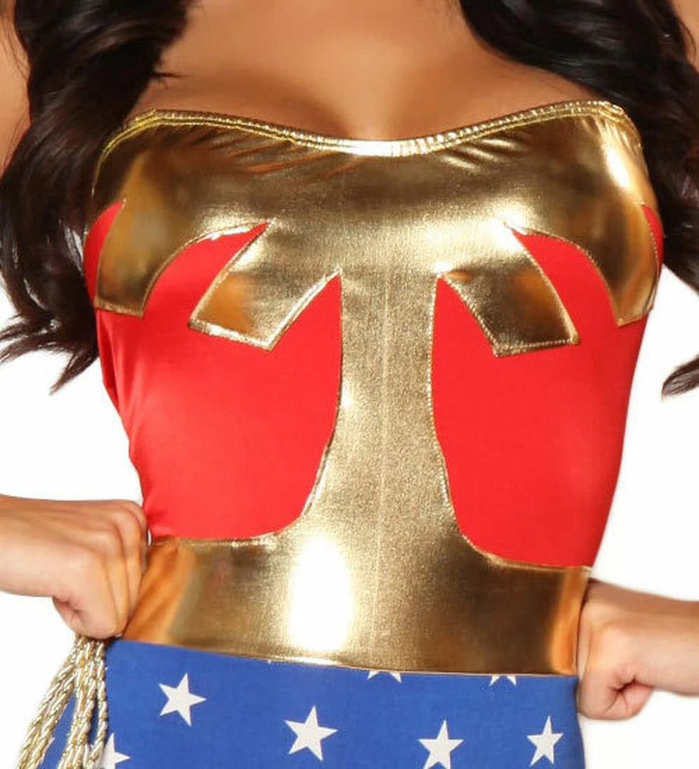 Be the best dressed, sexiest American Hero at the party or fulfill his wonder women super hero fantasy. Either way, you win when you assume a persona of strength and beauty with the American Hero. This pull up romper comes complete with Gold Lasso Loop and Gold Lasso. Top off the look with with the Matching Star Embroidered Headband that is also included. In this American Women Hero costume you will be the wonder of all your friends, while attracting the attention of all the guys in the room. It’s easy to assume the personality of the American Hero when you are dressed head to toe in this high quality costume.