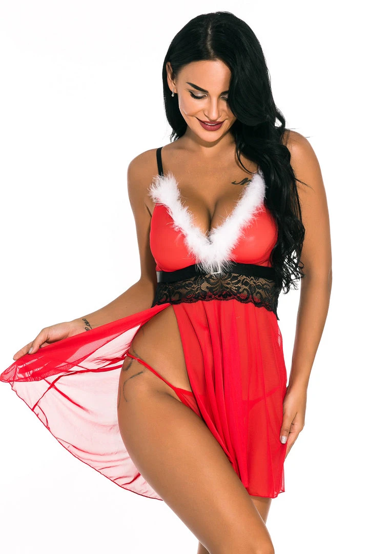 This sleigh it babydoll features a front slit, black lace midsection, rhinestone buckle, white marabou trim, adjustable straps, and thong.