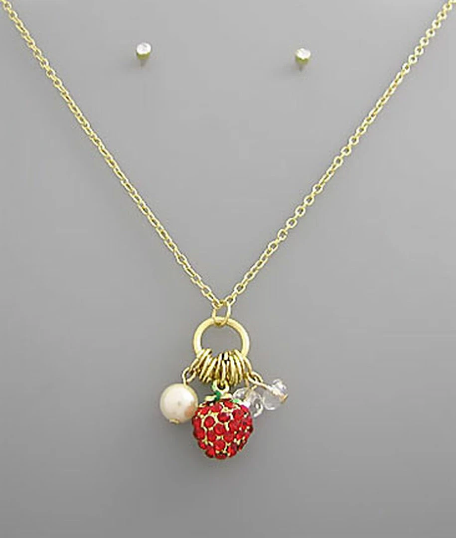 Metal Link Chain Necklace featuring a Crystal Strawberry, Pearl and Charms includes 3mm Post Earrings. Free Jewelry Box includedCharms: 1″ Necklace Length: 16″