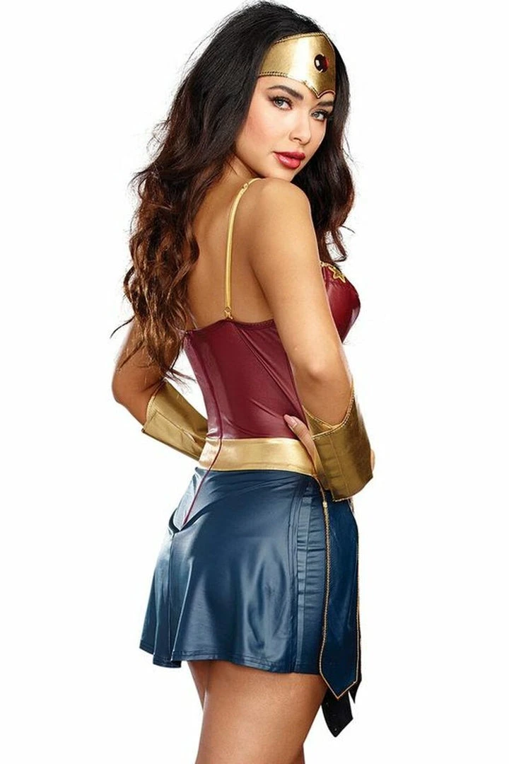 Super Heroes have fun too! Become a Goddess of the Amazon wearing this powerful three-piece woman costume ensemble. The form-fitting, bustier-style romper features sequin stars along the bust, gold spaghetti straps, and an attached pleated skirt with gold stars. The romper has a red bodice and blue skirt to complete the superhero look as well as matching gold wrist cuffs and headpiece.