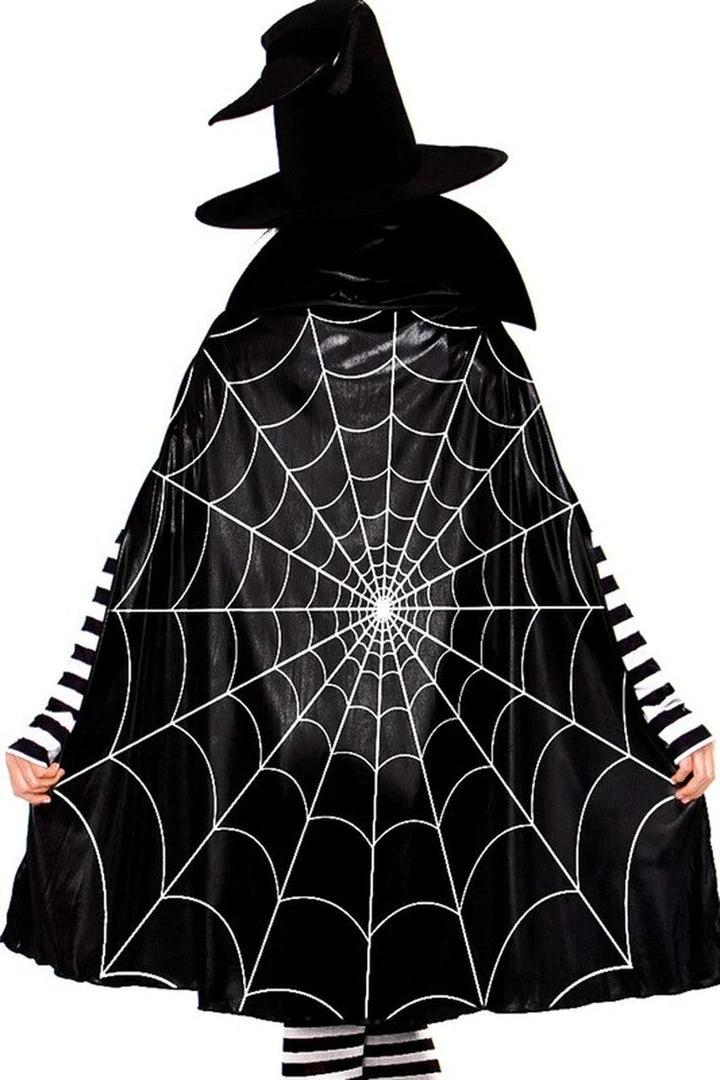 Why wait until Halloween to work your magic? Leave them spellbound in the Black Widow Witch Costume. The classic witches hat and black widow cape (web design on the back) both set off this clever ensemble. A black vested top comes with black and white striped sleeves with open-tip gloves are attached by sheer black fabric. Hipster black skirt has double sheer-cut slits in front for the peek-a-boo effect. Black and white striped thigh-high stocking and black bra sold separately. Available in women’s sizes S (2-6), M (6-10), and L (10-12).