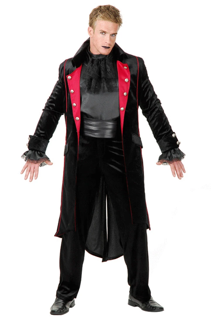 This Men’s Twilight Vampire costume includes a long black coat with a red lapel, button details, and lace sleeves. (Pants and shirt not included.)