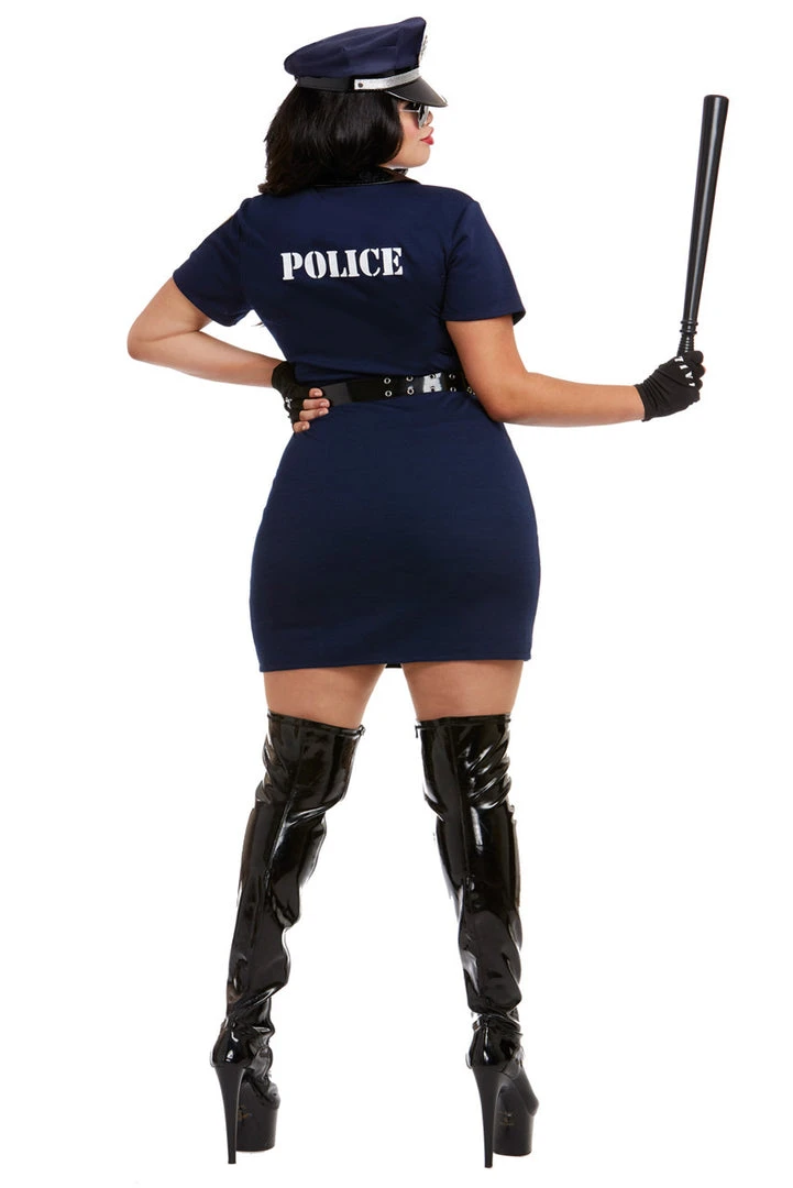 This Plus Size Officer Pat U Down costume features a blue mini dress with button details, a belt, handcuffs, a badge, name plate, gloves and matching police hat. (Sunglasses and baton not included.)