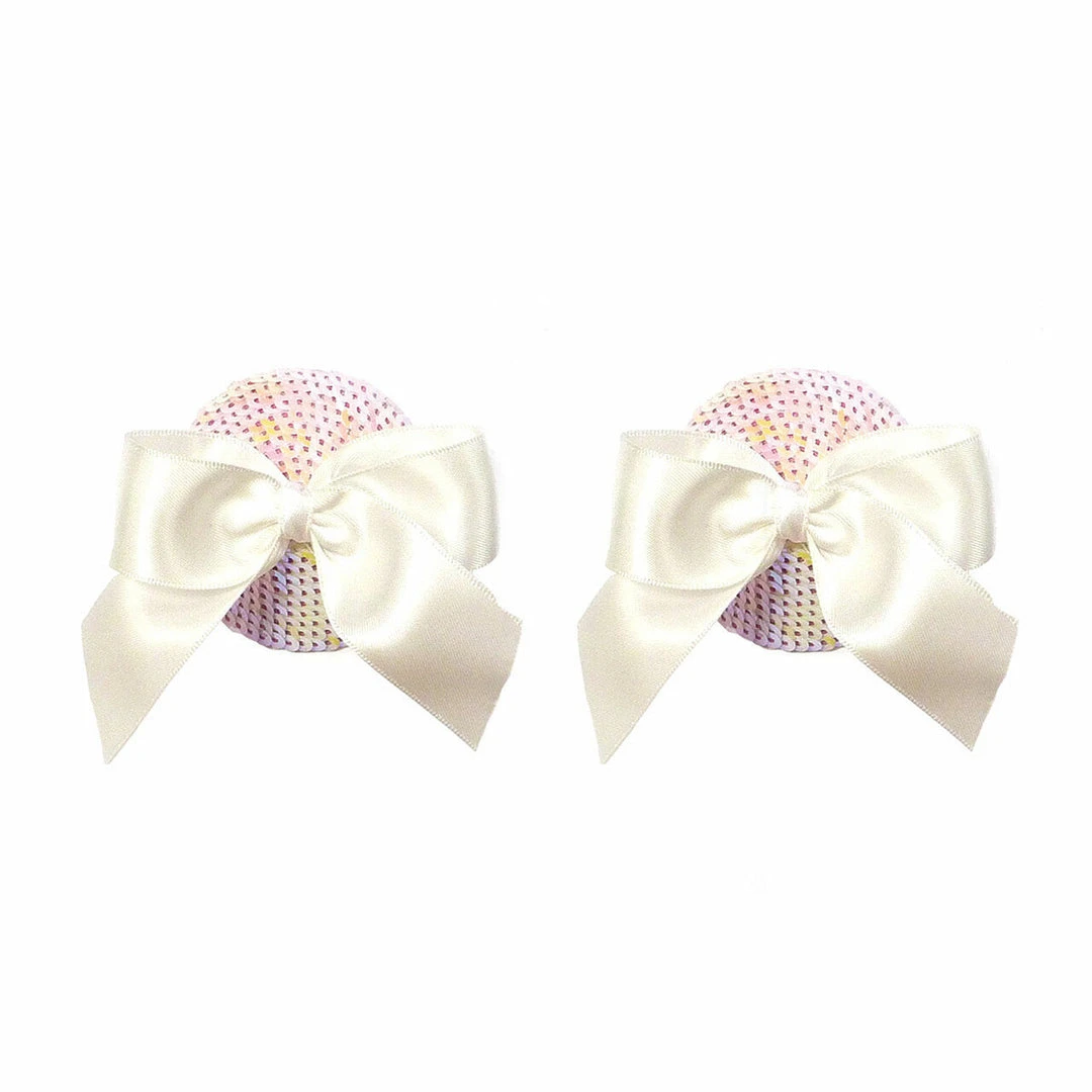 A couture line of burlesque inspired nipple covers, it’s Nippies like they’ve never been seen before – dazzling, glamorous, and show stopping (the tassel twirl has always been a crowd favorite). Chic designs with quality adornment update this classic to a jaw dropping style to wear for an alluring striptease, a burlesque-inspired performance or to spice up the boudoir for brides-to-be. Backed with a custom adhesive, Nippies Gold are washable & reusable 20-30 times for spellbinding stripteases time & time again. Marilyn White Bows features iridescent pink sequins paired with white satin bows.