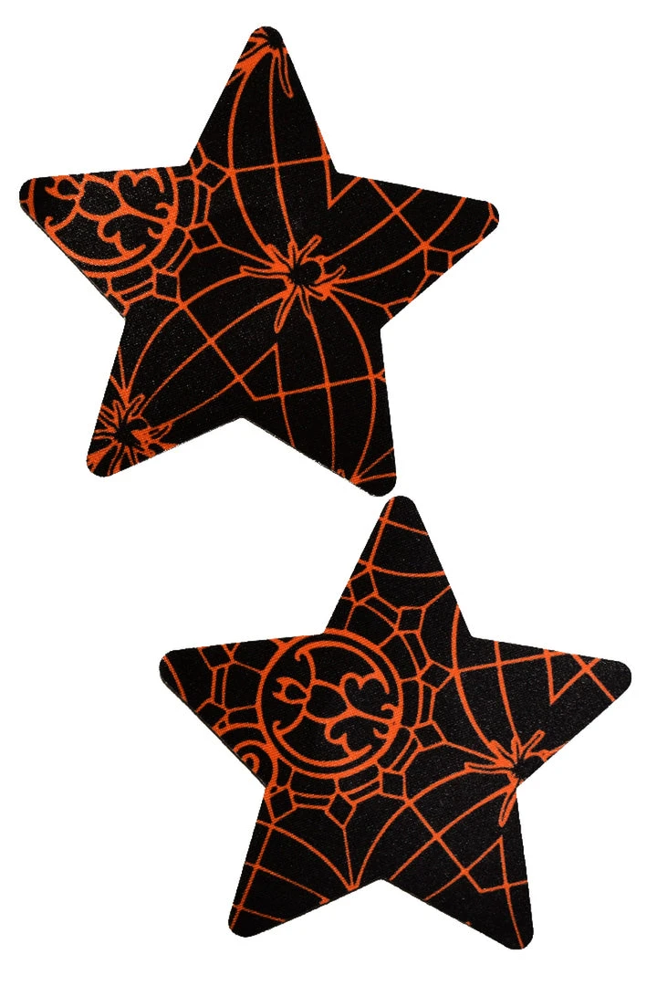 Black and orange spiderweb star nipple pasties. Feature self adhesive tape, just peel and stick on clean, dry, oil-free skin.
