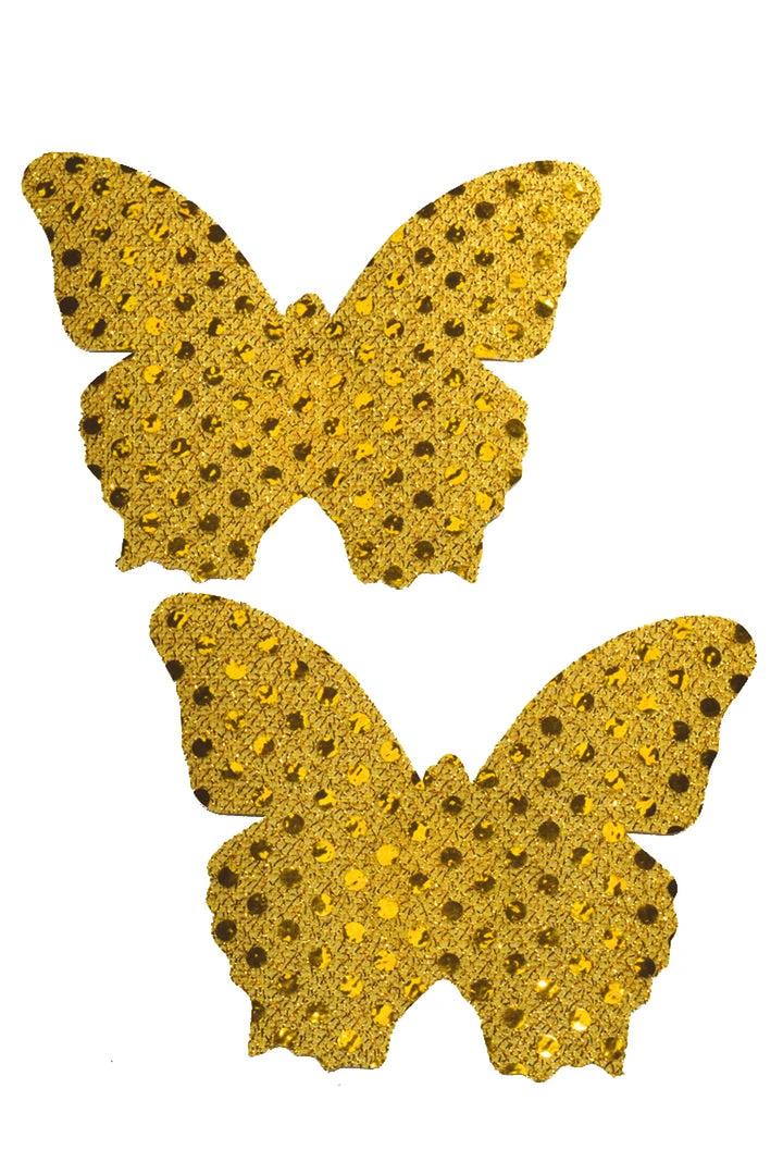 Yellow Gold Sequin Butterfly nipple pasties. Features self adhesive tape, just peel and stick on clean, dry, oil-free skin!