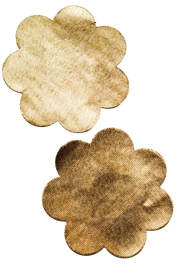 Metallic Gold petal nipple pasties. Feature self adhesive tape, just peel and stick on clean, dry, oil-free skin.