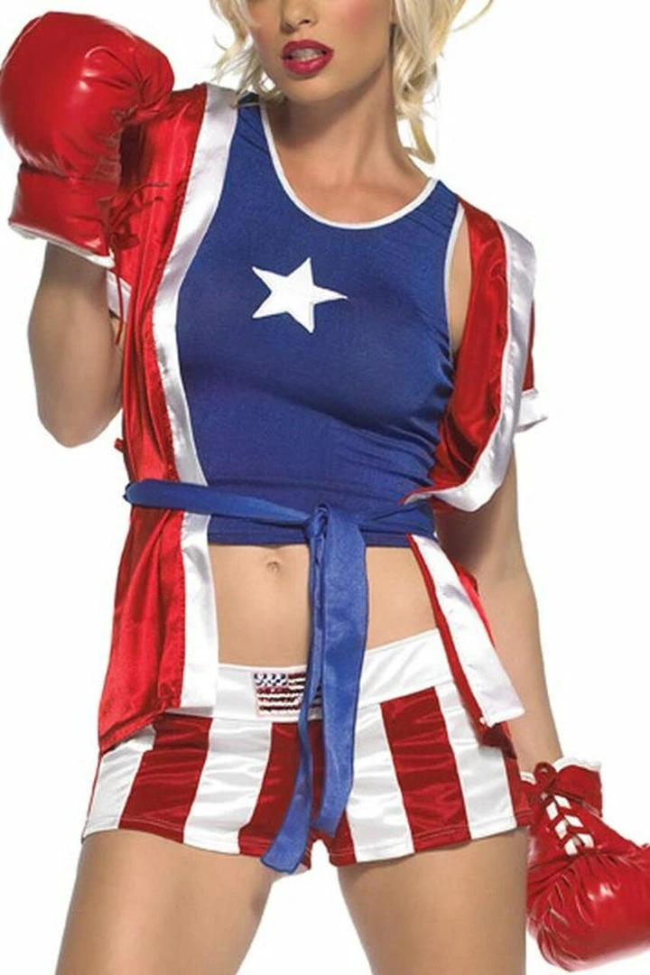 Knock out champ boxer costume for women is a 3 Piece outfit; a blue top with white star emblem, white and red striped shorts, and a silver and red robe with a blue belt. Whether you are excising in the gym or in the ring, you will be complete for a little spicy fighting in this sexy boxer costume. It does not include LA1002 boxing gloves. Get in action with Knock out Champ Boxer Costume for automatic win.