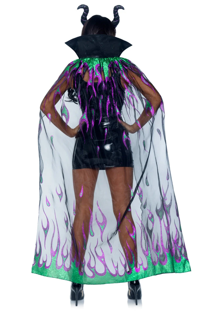 This evil, two-piece set includes a black mesh cape with green and purple glitter flames, attached stay up collar, tie front, and matching horn headband. (Dress not included.)