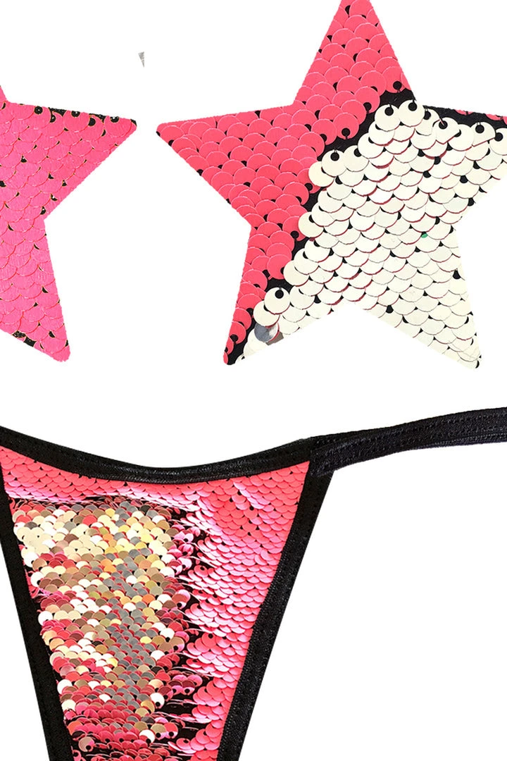Black-light reactive, this Bitchin’ Flip Sequin Nipple Pasties & G-String Panty features an explosion of awesomeness in one package! This three piece package includes a pair of black-light reactive pink and silver flip sequin star nipple pasties that form seamlessly to curves. Wave your hand over the sequins and watch them flip from black-light reactive pink and silver! Includes a matching G-string thong panty with flip sequins over mesh and a stretch nylon waistband. Available in 8 different colors!