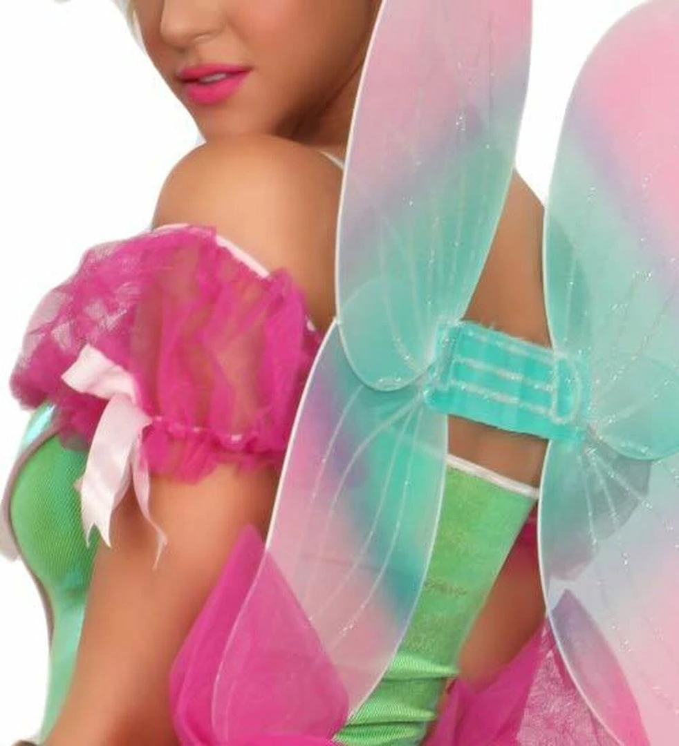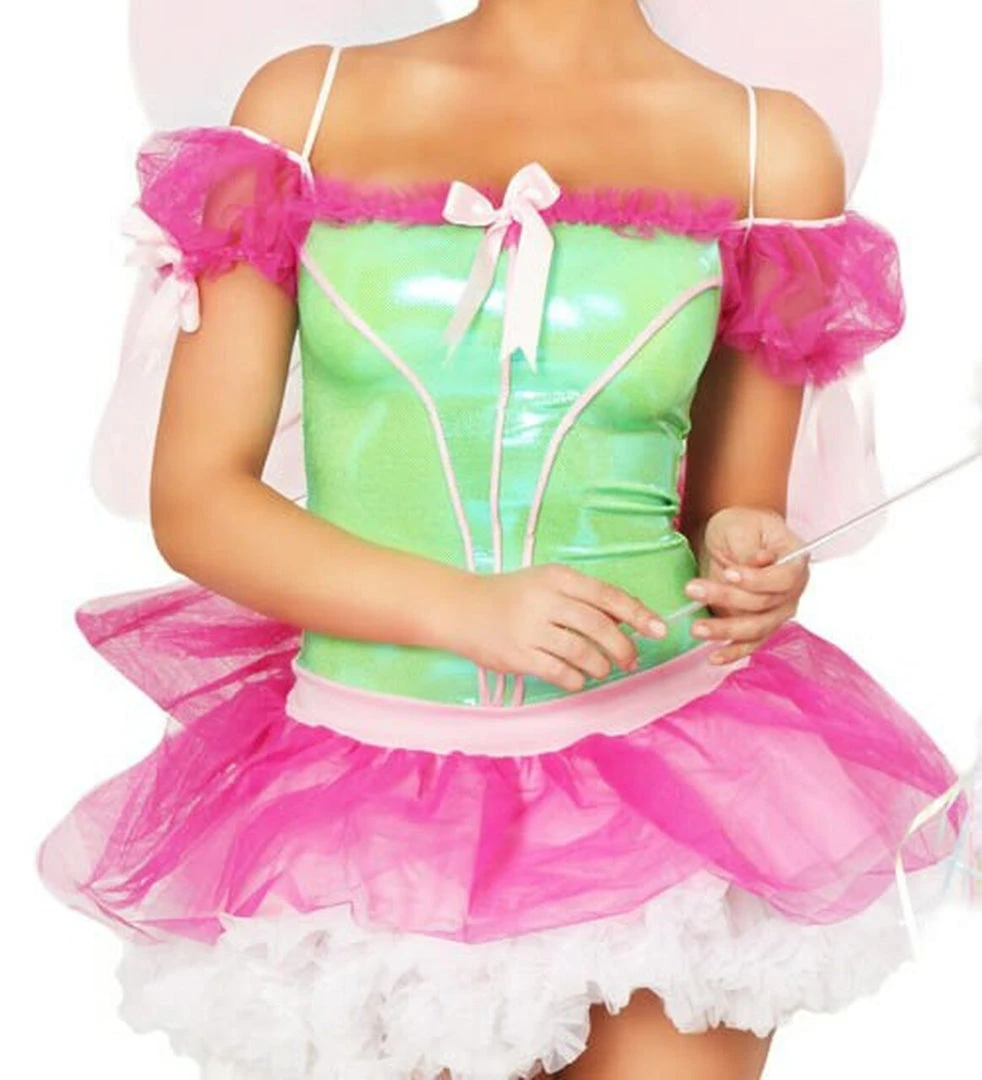 Cause a little mischief and mayhem in this Rainbow Sprite Fairy Costume with gorgeous green stretch mini dress which boasts miniature reflective dots, as well as seductive off the shoulder pink puffy sleeves, pink tulle trim along the neckline and a cute bow. Attached is a tutu style pink tulle skirt, with large bow detail at the back, and white ruffle layers. To complete the ravishing look, the Rainbow Sprite Fairy Costume comes with pretty rainbow wings.