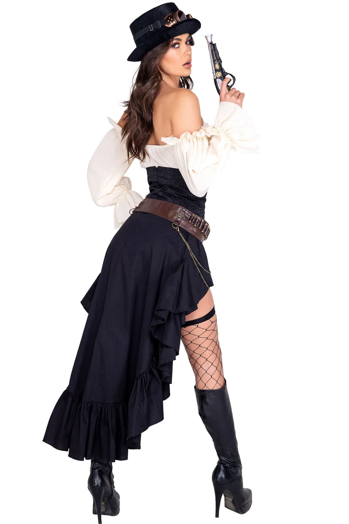 This six-piece, Steampunk Seductress costume includes a ruffle trimmed crop top with attached sleeves, a brocade waist cincher with attached gold buttons, an attached ruffled skirt with a high/low hemline, brown belt with attached chain, hat, goggles, and toy gun.